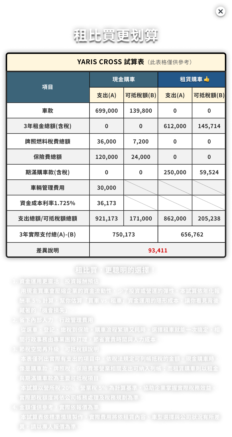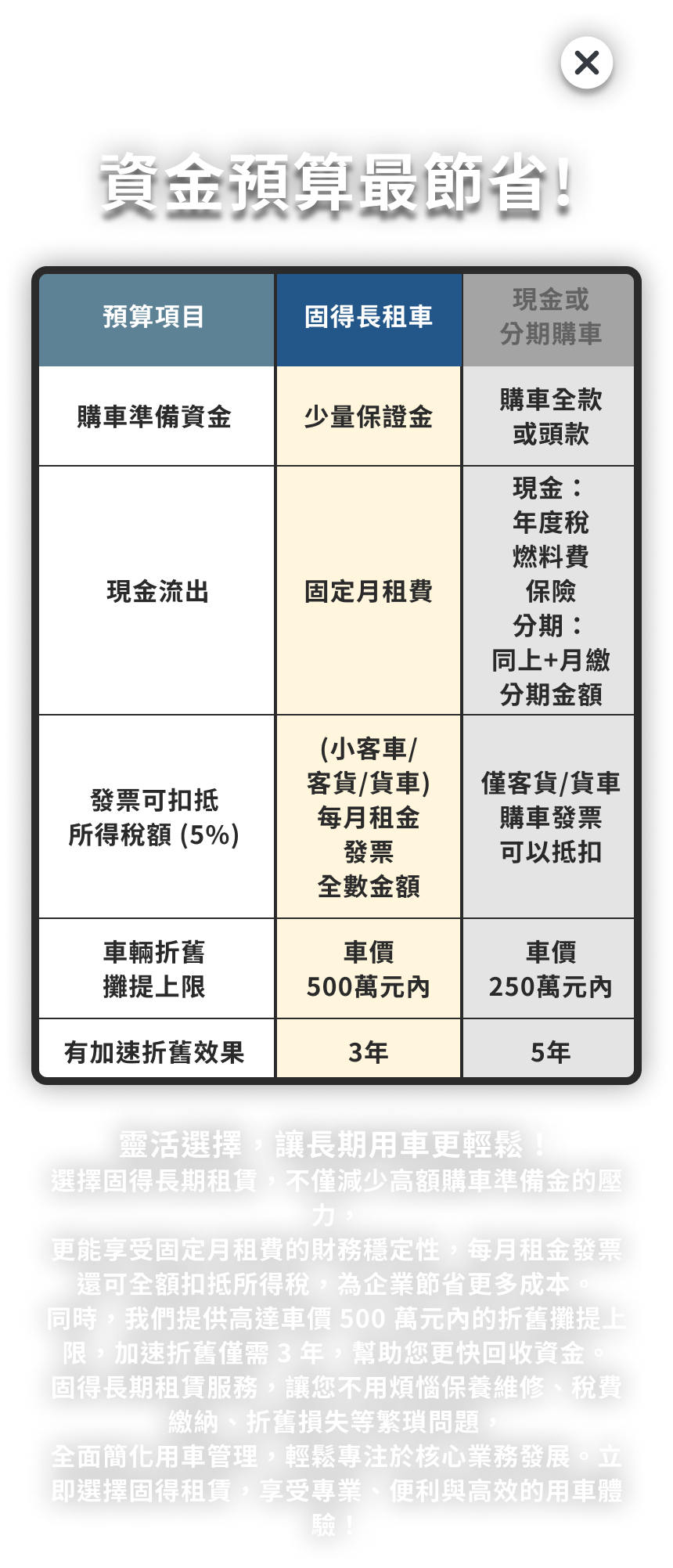 打造「合法節稅、靈活資金運用、專業車輛管理、穩定用車保障」四大核心特色,全面滿足您的需求,讓租車成為購車之外的明智選擇